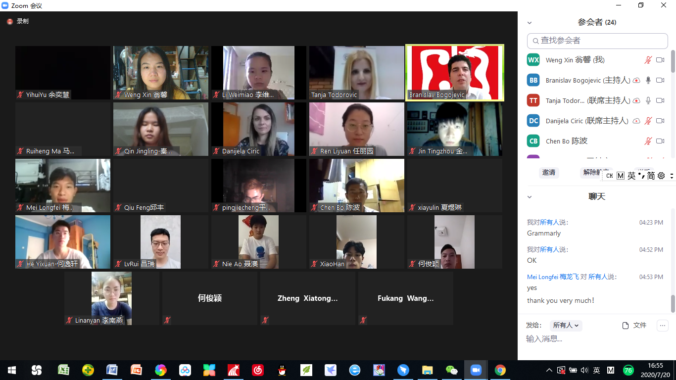 在交流活动的最后,营员们分享了学习成果和体会。教授们认真倾听了每一位同学的发言,并逐一进行亲切而专业的点评。720日,在结营仪式上,Bojan Lalic教授对中塞合作暑期线上交流项目的成功开展表示祝贺,认为双方的交流合作是卓有成效、意义重大的,并期待能进一步加强与浙大的合作。