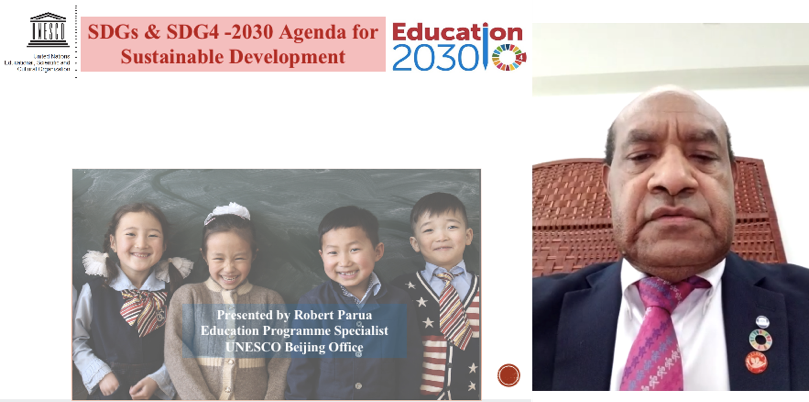 联合国教科文组织驻华代表处(中国北京)教育专家裴伯庸(Robert Parua)先生聚焦“教科文组织与可持续发展目标4(SDG 4)”的主题,向与会师生介绍了教科文组织的性质、组织结构以及五个主要职能,即新思想实验室、标准制定、信息共享中心、能力建设以及国际合作推动。Robert先生结合多年教科文组织的工作经历,立足于教科文组织教育领域协调者的角色,详细论述了教科文组织在国际、地区和国家层面内推动可持续发展目标4所做的努力和贡献,着重介绍了教科文组织北京办事处在中国的重点工作领域。