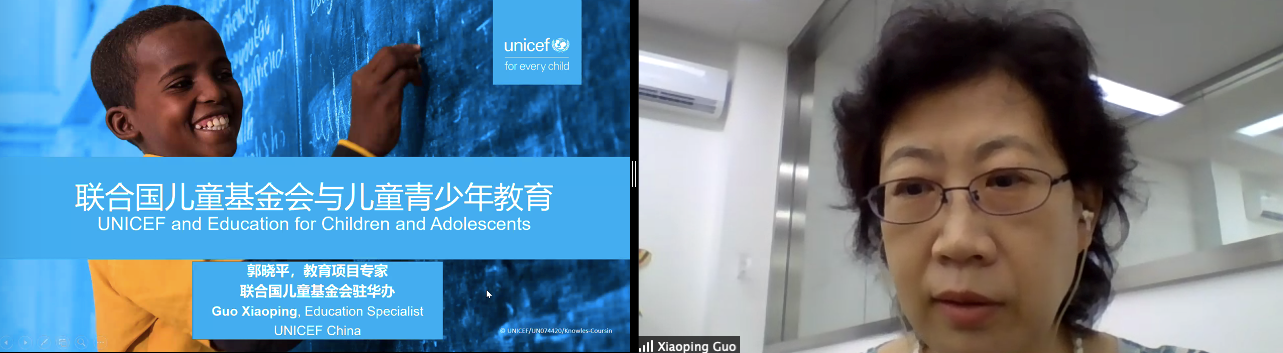 联合国儿童基金会驻华代表处(中国北京)资深教育专家郭晓平女士作“联合国儿童基金会与儿童青少年教育”主题演讲,从联合国儿童基金会的使命和基本原则谈至儿基会的教育理念和战略,再结合个人的工作经历分析了儿基会在华四十年的教育实践和成就,着重分享了爱生学校项目、社会情感学习项目等颇具成效和影响力的项目开展情况。